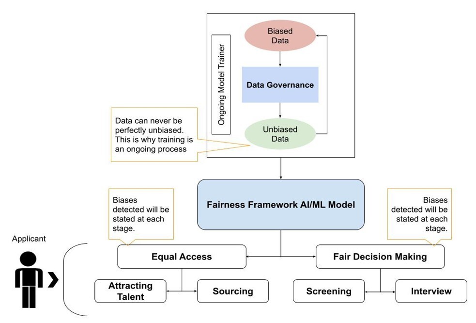 Flowcharts illustrating bias identification, mitigation strategies, and evaluation processes.